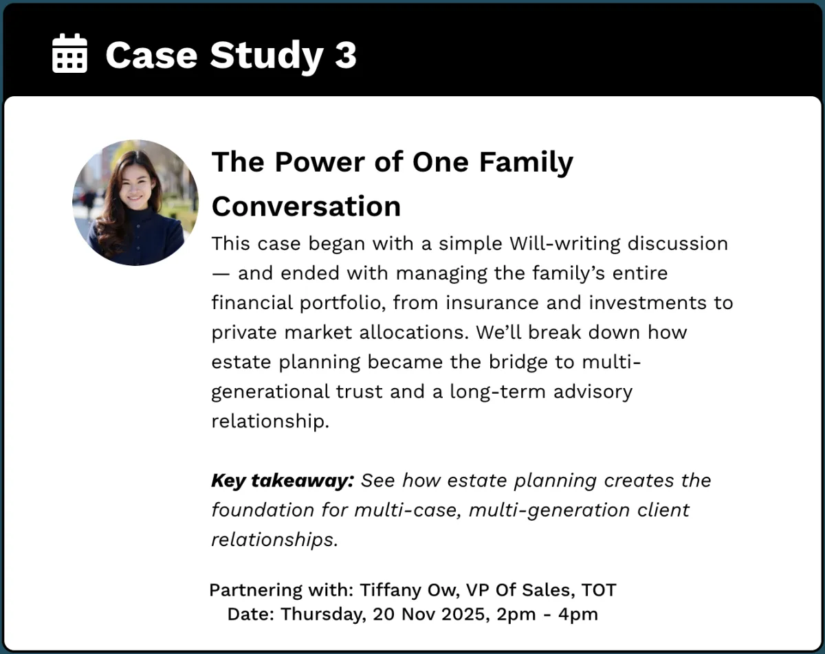 This case began with a simple Will-writing discussion — and ended with managing the family’s entire financial portfolio, from insurance and investments to private market allocations. We’ll break down how estate planning became the bridge to multi-generational trust and a long-term advisory relationship.