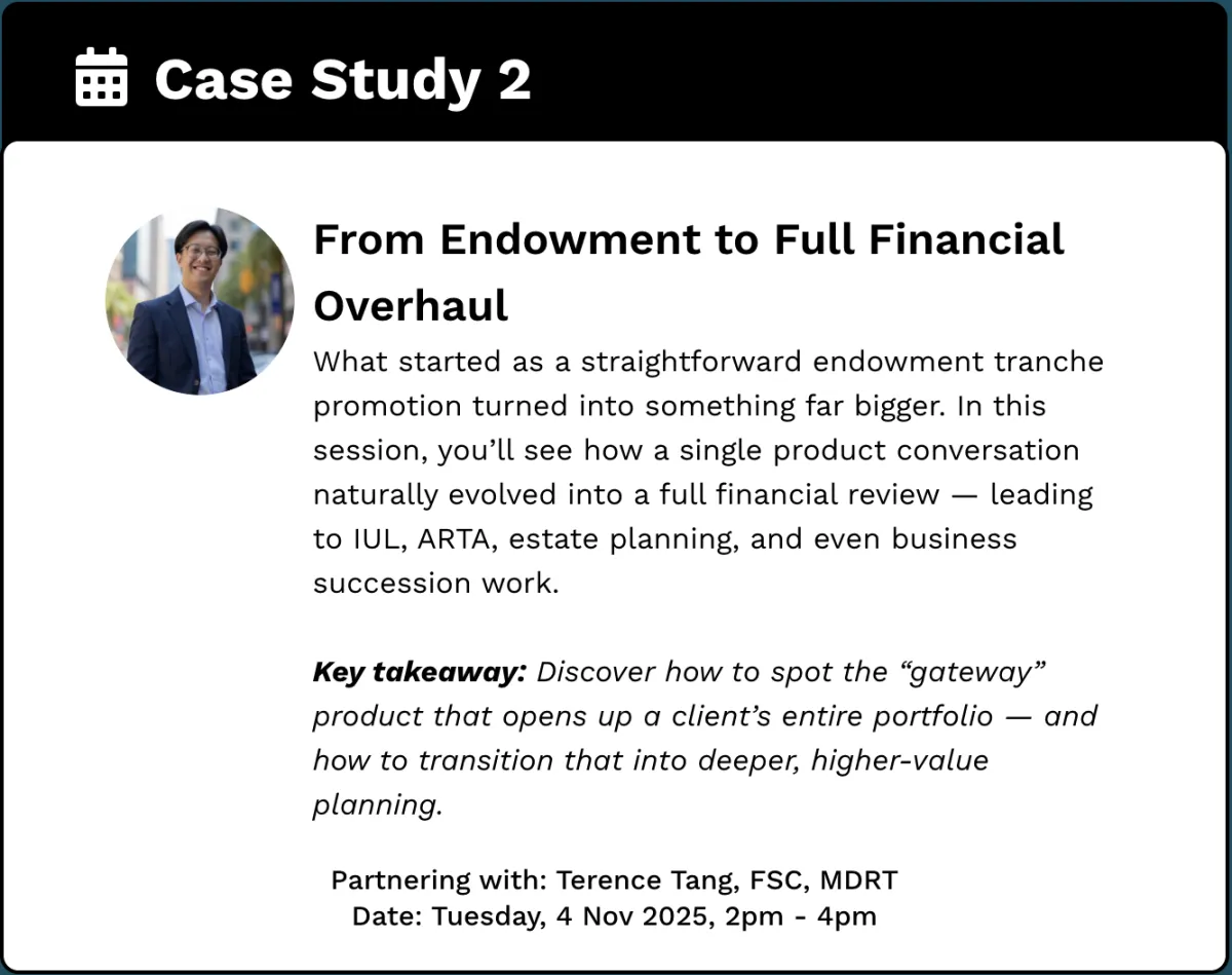 What started as a straightforward endowment tranche promotion turned into something far bigger. In this session, you’ll see how a single product conversation naturally evolved into a full financial review — leading to IUL, ARTA, estate planning, and even business succession work.