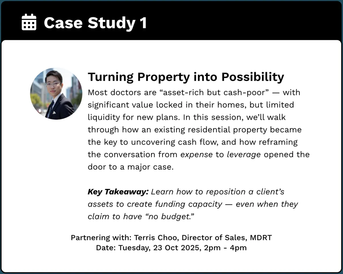 Most doctors are “asset-rich but cash-poor” — with significant value locked in their homes, but limited liquidity for new plans. In this session, we’ll walk through how an existing residential property became the key to uncovering cash flow, and how reframing the conversation from expense to leverage opened the door to a major case.