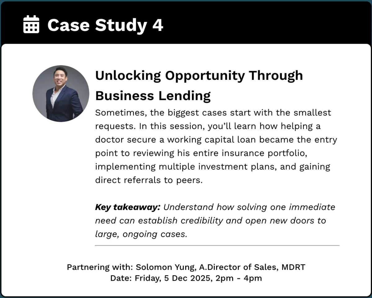 Sometimes, the biggest cases start with the smallest requests. In this session, you’ll learn how helping a doctor secure a working capital loan became the entry point to reviewing his entire insurance portfolio, implementing multiple investment plans, and gaining direct referrals to peers.